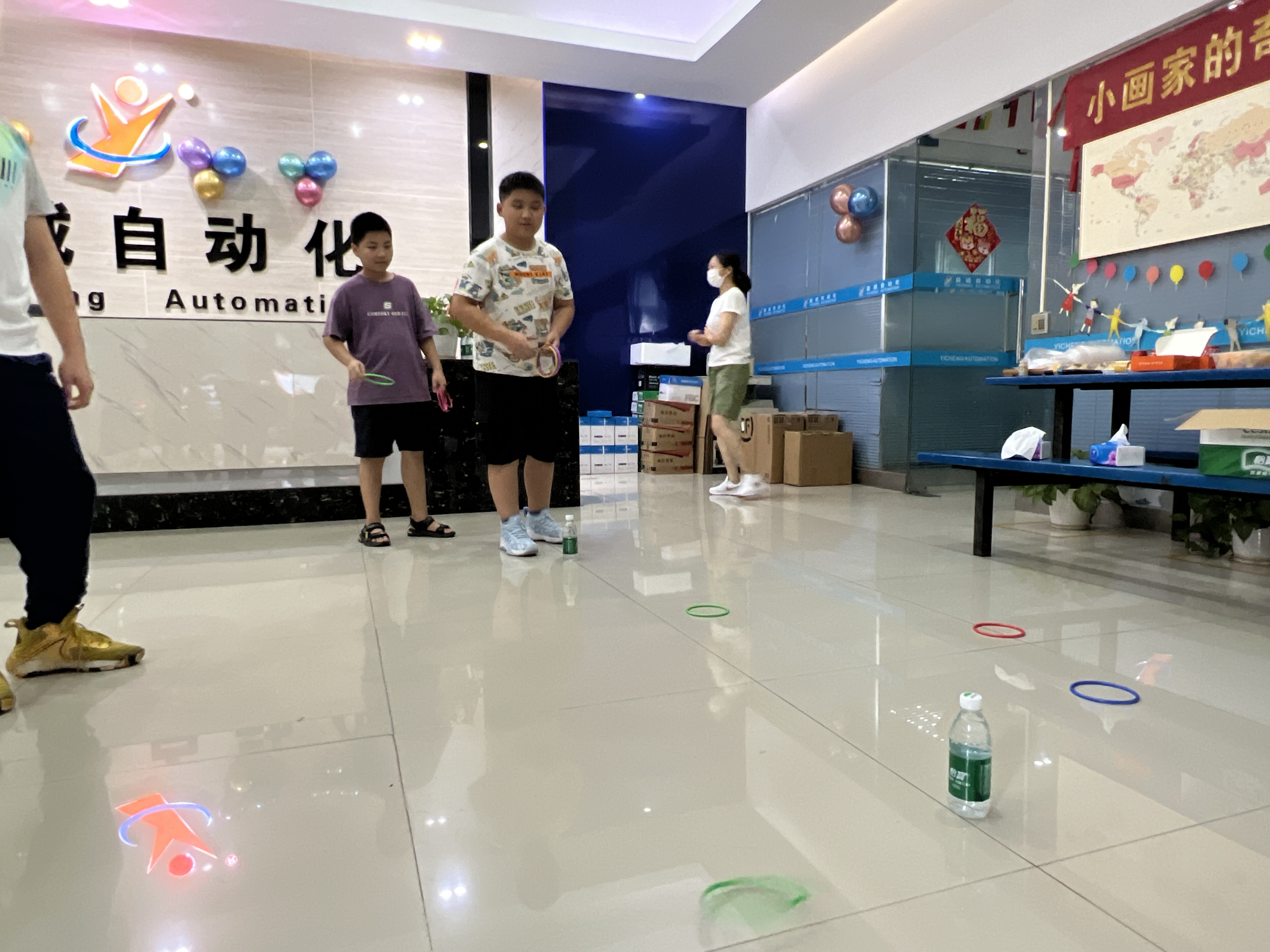 繪畫比賽之余,趣味套圈小游戲區(qū)域也是熱鬧非凡。一個個色彩鮮艷的小圈擺放在地上,孩子們排著整齊的隊伍,眼睛緊緊盯著目標,躍躍欲試。