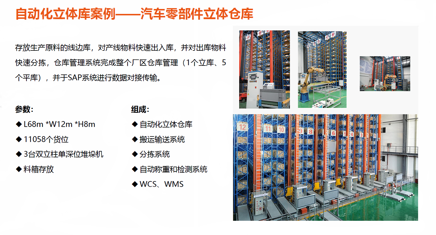 項(xiàng)目主要組成:高層貨架、托盤(pán)(貨箱)、巷道堆垛機(jī)、輸送機(jī)系統(tǒng)、AGV系統(tǒng)、自動(dòng)控制系統(tǒng)、庫(kù)存信息管理系統(tǒng)。